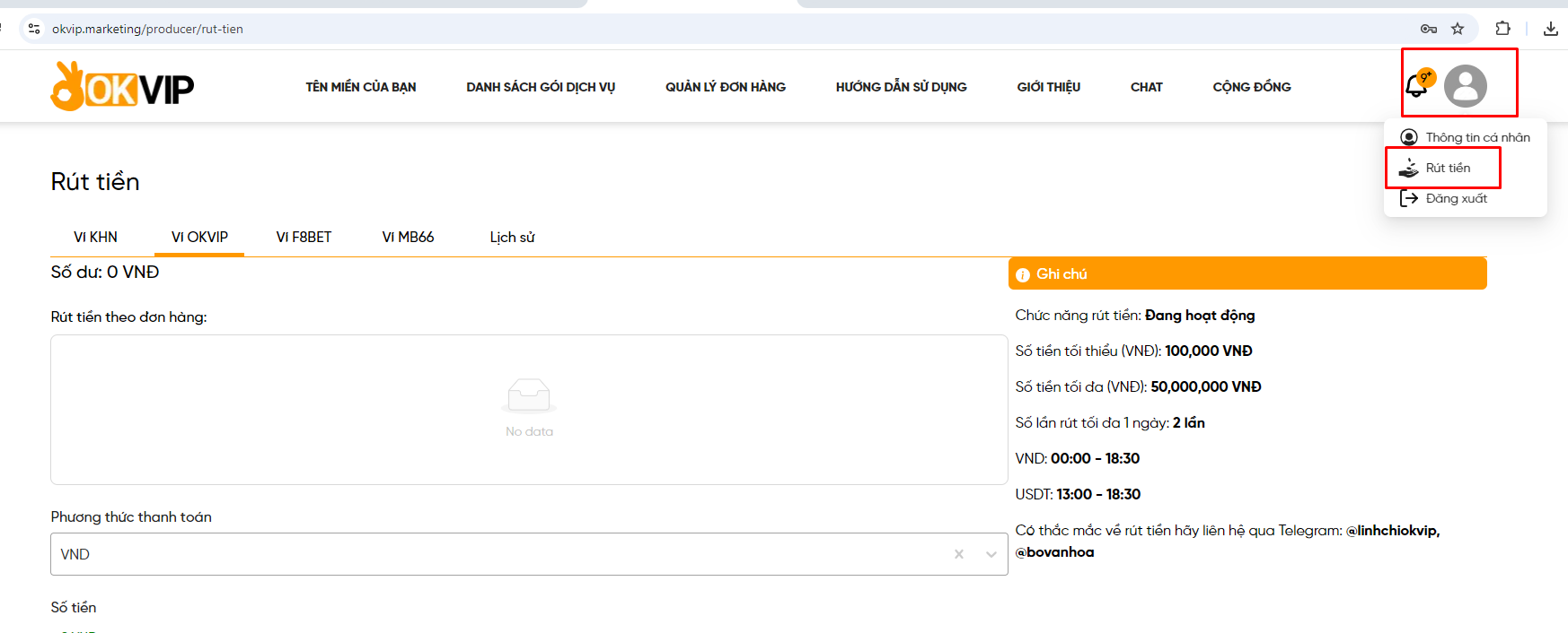 - Chọn phương thức thanh toán: Hiện tại OKVIP đang cung cấp hai phương thức thanh toán là VND và USDT. Đối tác muốn rút tiền bằng cách nào thì chọn vào đó và điền thông tin thanh toán cần thiết.